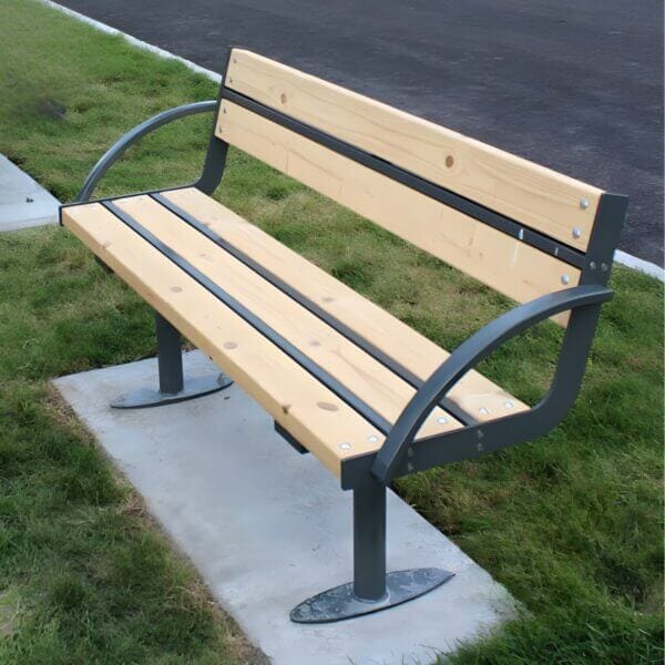 De bank rust op twee stalen voetplaten met voorgeboorde gaten voor een stevige verankering in de ondergrond. De zitting en rugleuning bestaan uit brede hardhouten latten, bevestigd met roestvrijstalen bevestigingsmateriaal.