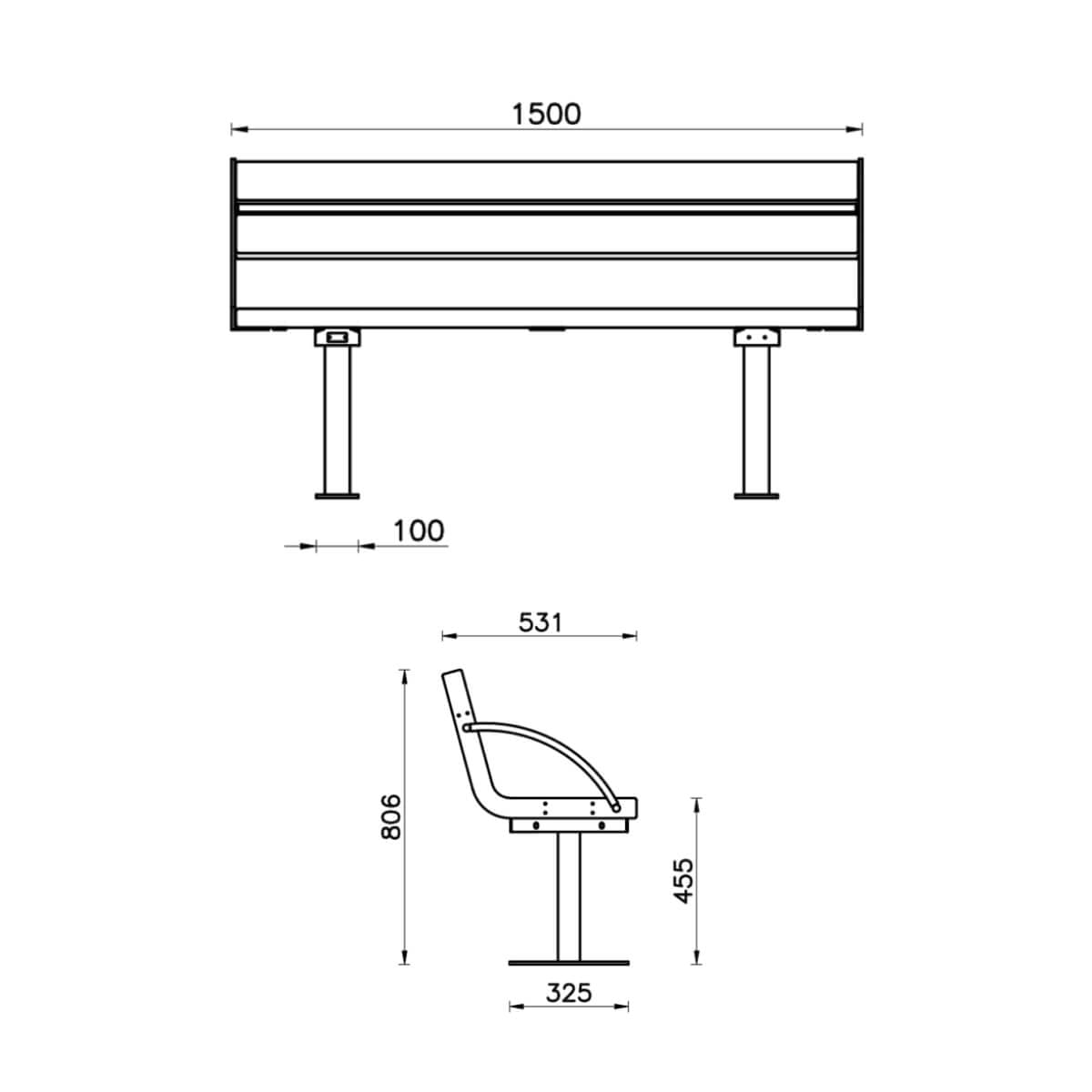 1500 mm lang, 531 mm diep, 806 mm hoog en 455 mm zithoogte.