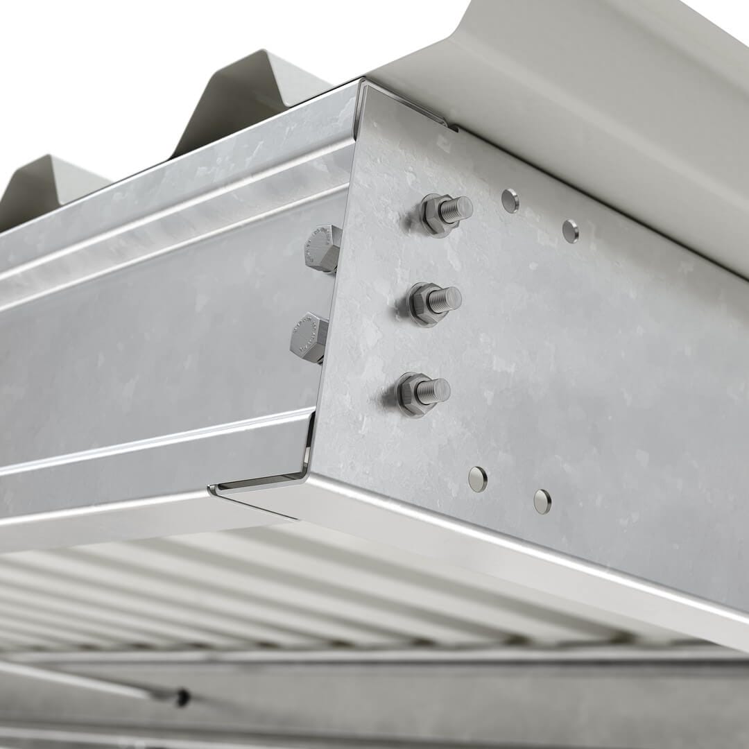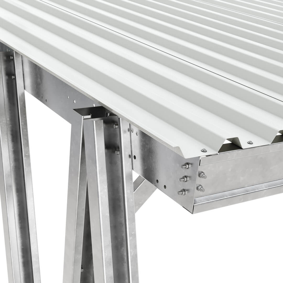 • Verzinkte staalconstructie met duurzame trapeziumplaatbekleding