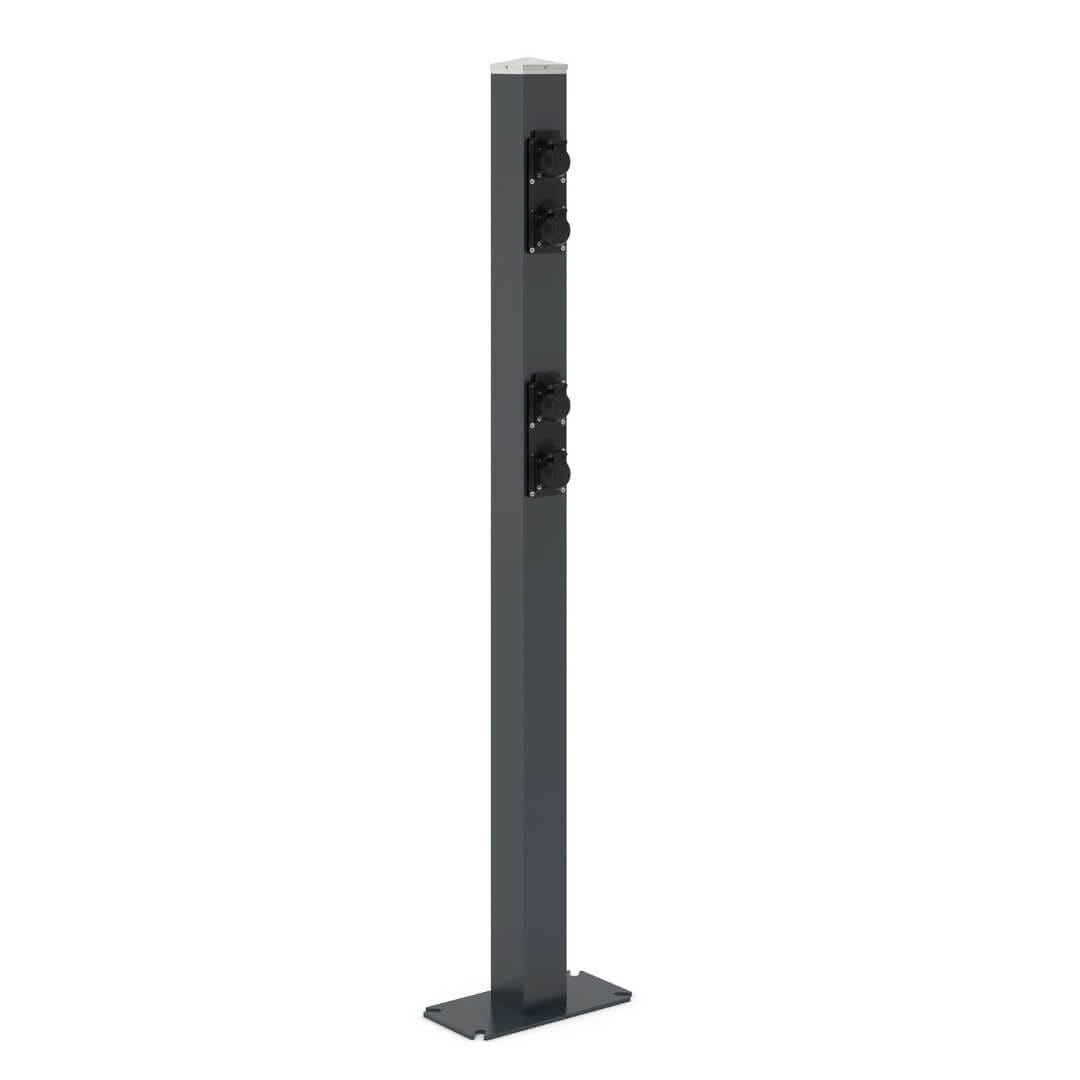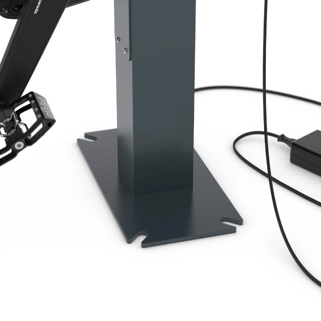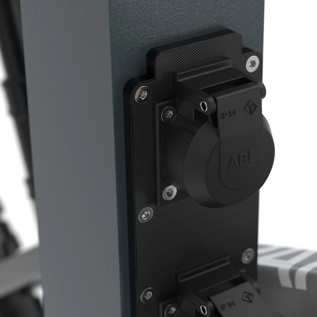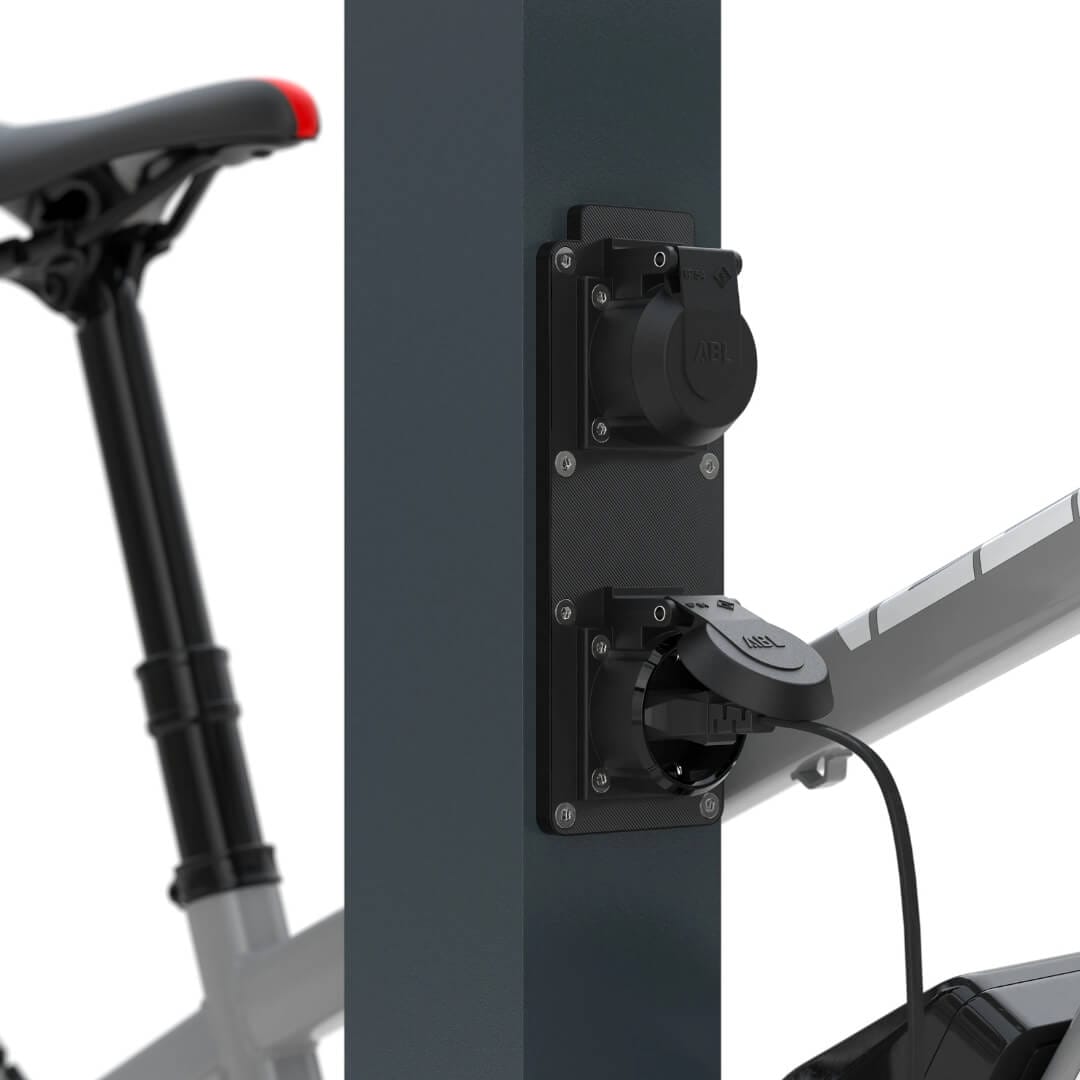 De geïntegreerde 230V randaarde stopcontacten (IP54) bieden een betrouwbare laadinfrastructuur voor elektrische fietsen. De e-bike laadpaal wordt gevoed via een ingebouwd voedingskanaal in de paal, verborgen onder een afdekplaat van 150 x 300 mm, met een kabelverdelingsdoos en voor gemonteerde WAGO elektrische connectoren.