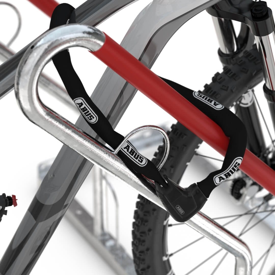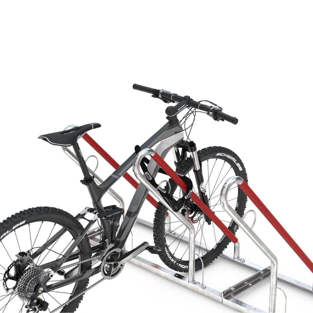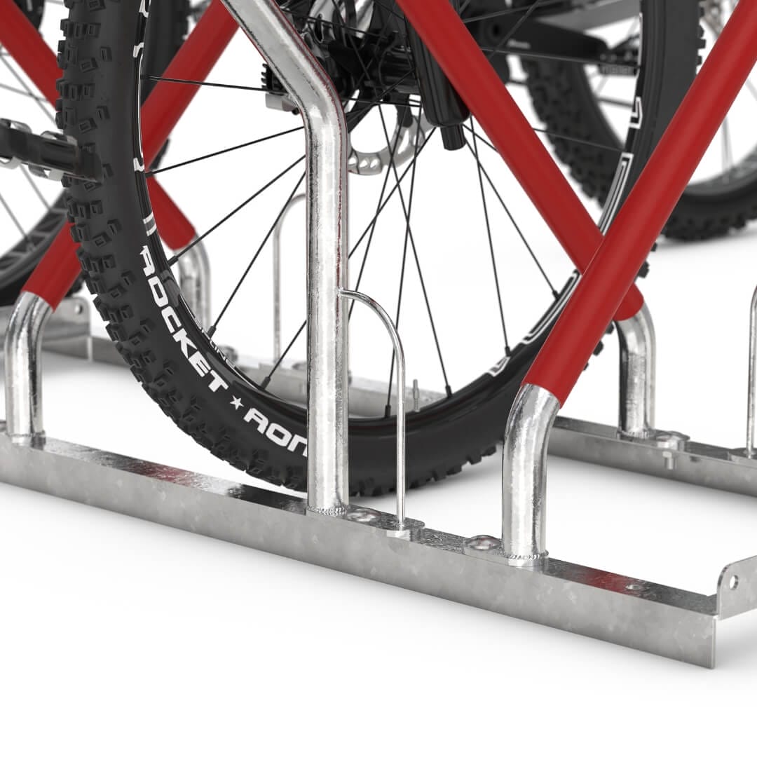 De beugels van het fietsenrek zijn voorzien van een aangelast slotoog. Hierdoor kun je fietsen met een brede band gemakkelijk parkeren en beveiligen. Dit fietsenrek is ideaal voor fatbikes en mountainbikes. De stootbescherming aan de voorkant van de beugel zorgt ervoor dat twee fietsen naast elkaar kunnen staan zonder elkaar te raken.