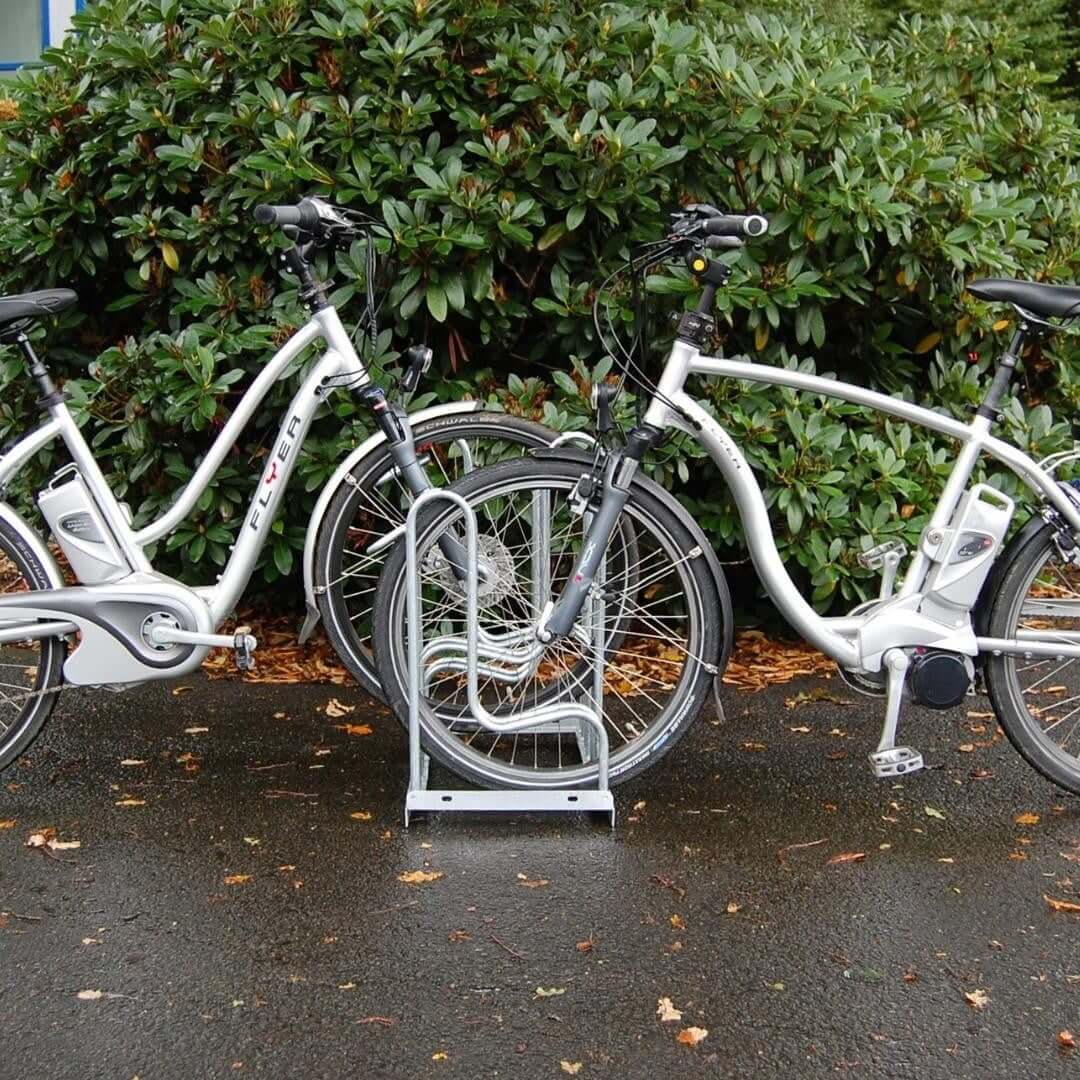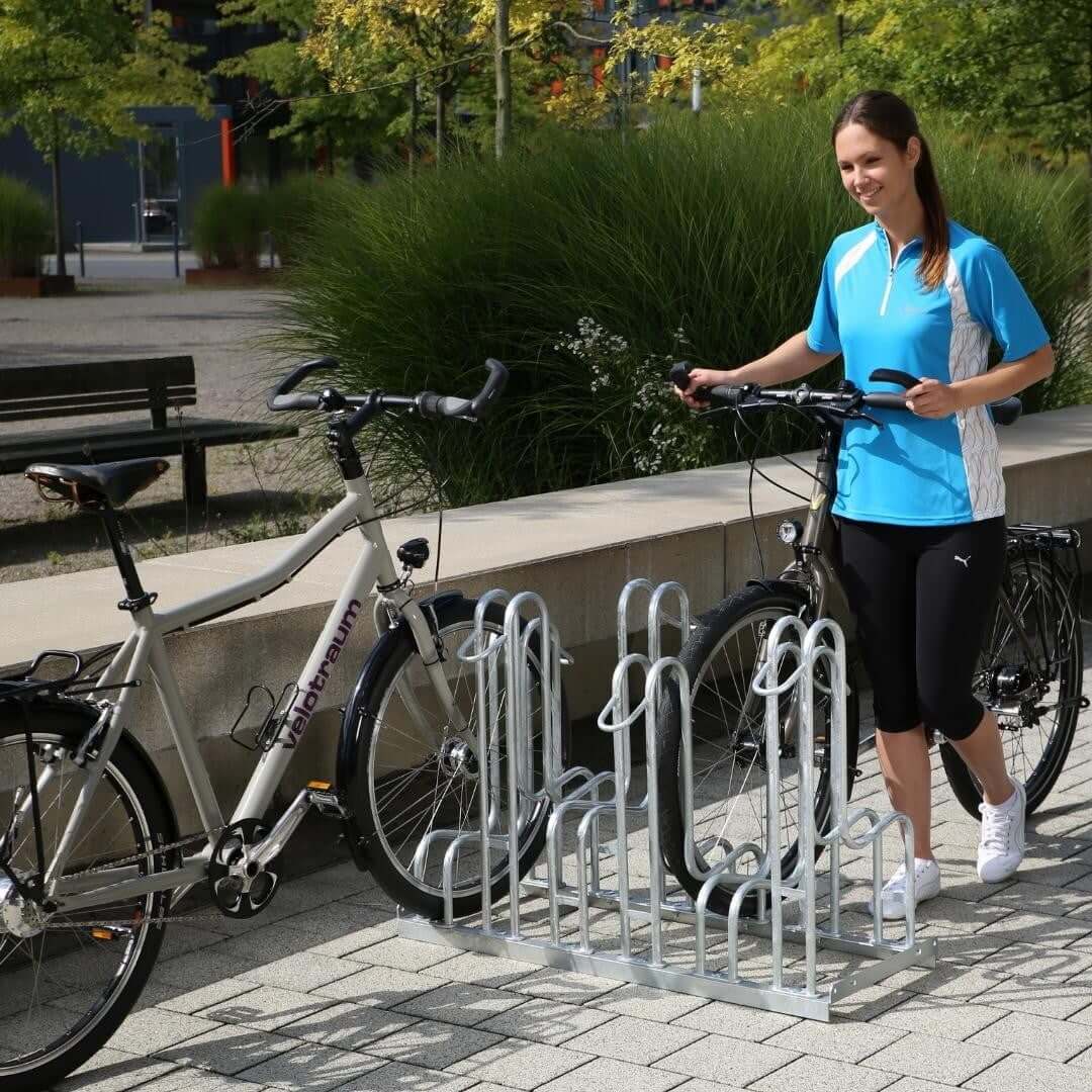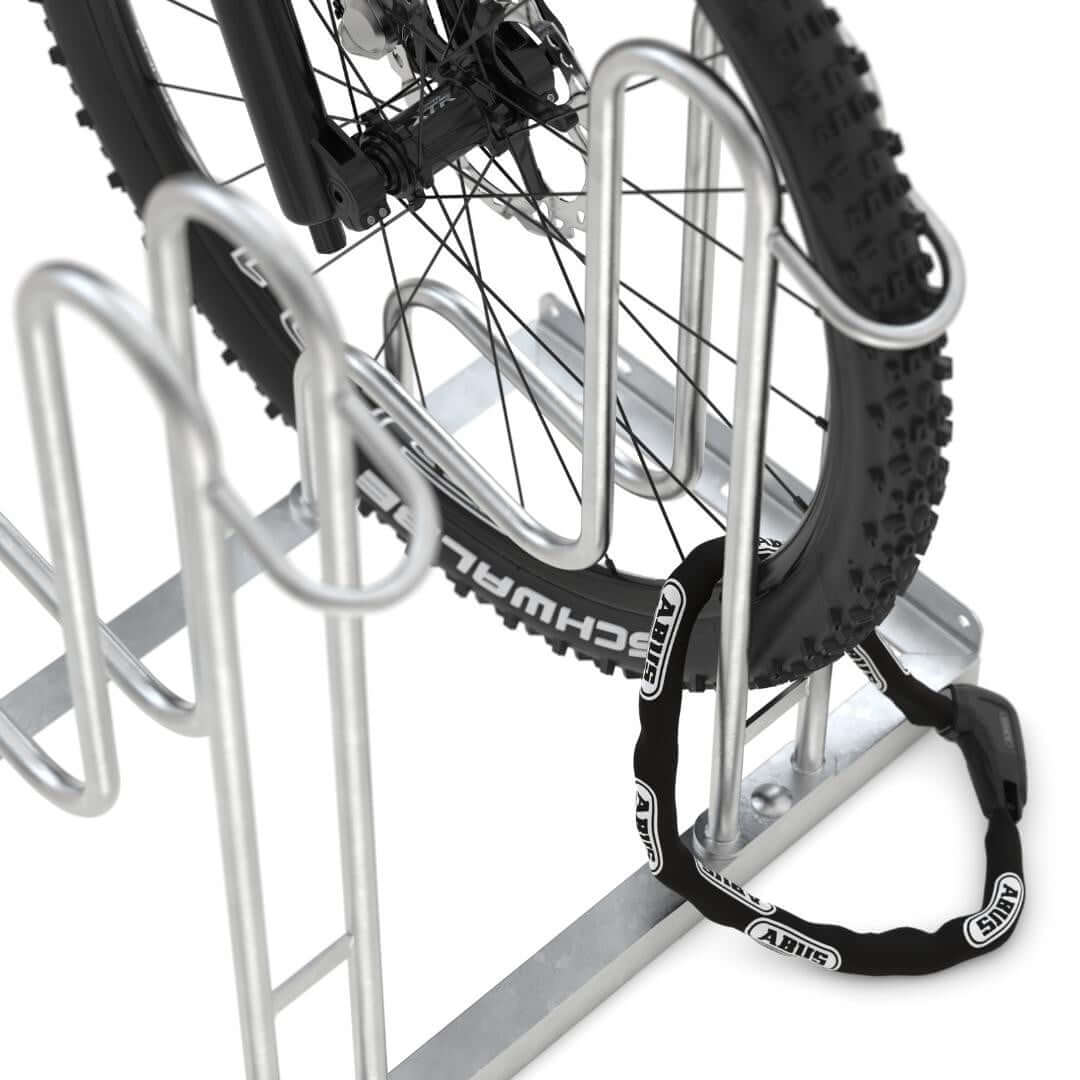 Een fietsenrek met beugels biedt meer stabiliteit dan standaard wielklemrekken. De L-vormige voorwielondersteuning van de 4000 BR: