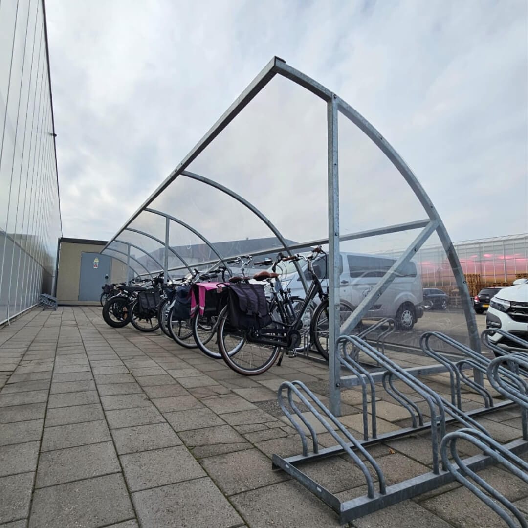 Duurzame fiets overkapping van verzinkt staal met helder dak. Bescherm fietsen tegen weer en wind op elke locatie.