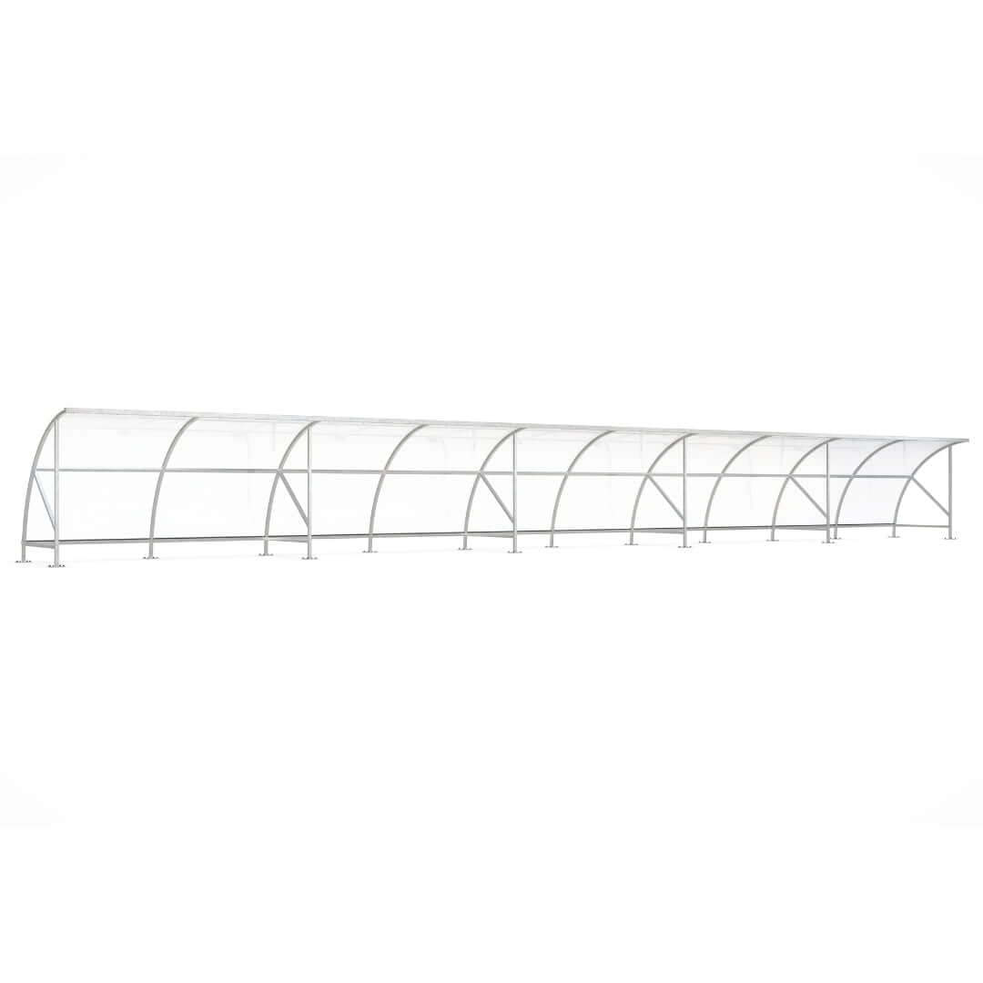 Fiets overkapping van 12 meter met verzinkt stalen frame en transparant polycarbonaat dak.