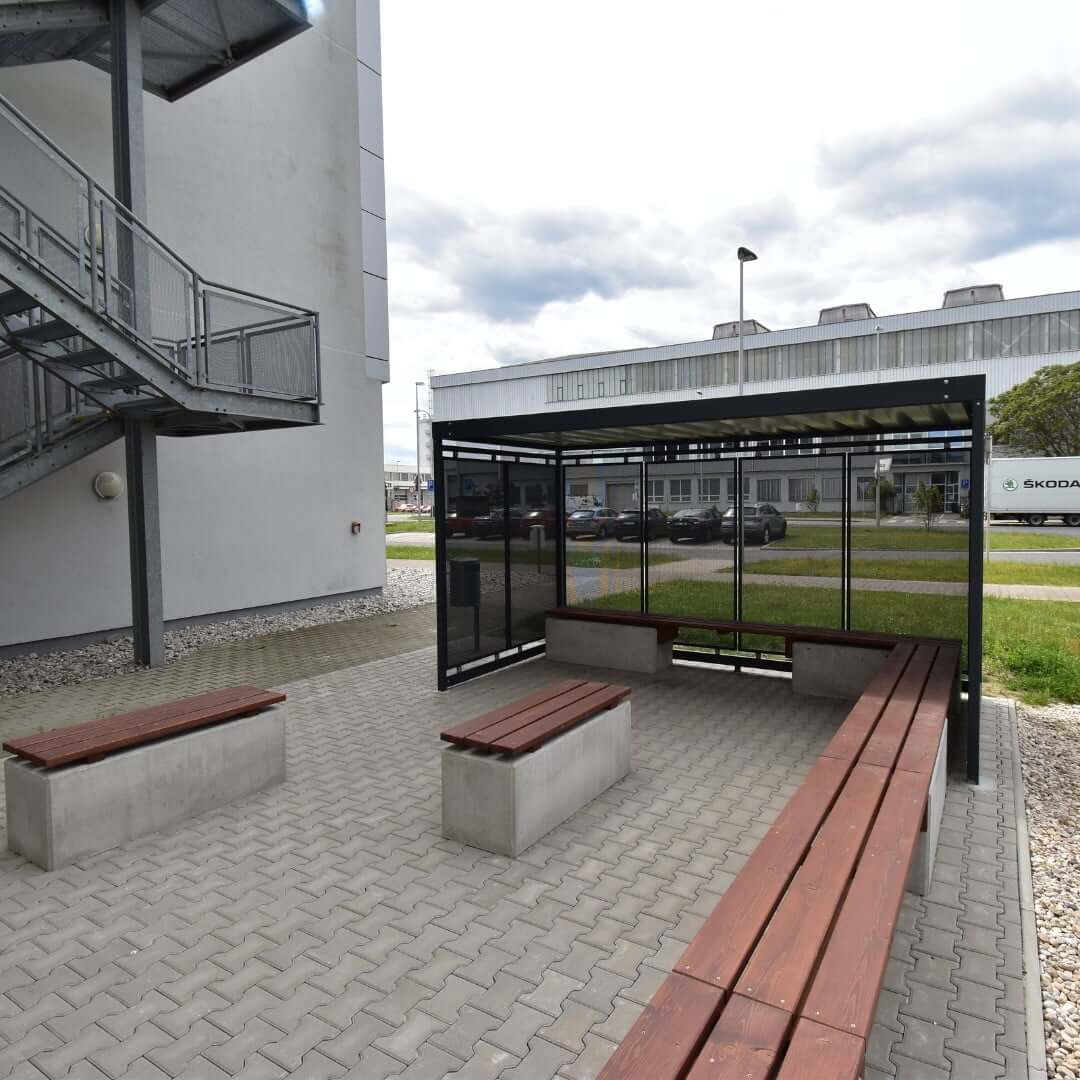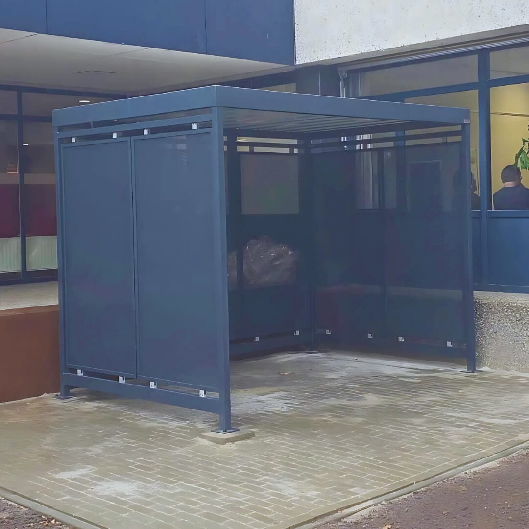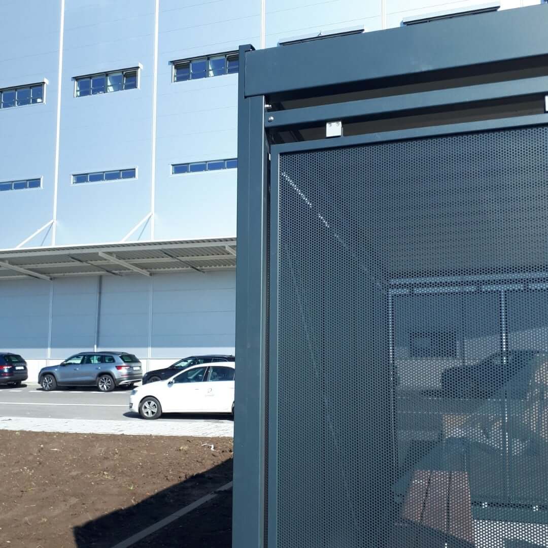 Fietsoverkapping Bonn is gemaakt van thermisch verzinkt staal, gecoat in een RAL-kleur naar keuze. Het witte dak (RAL9002) bestaat uit trapeziumplaten, de zijwanden uit geperforeerd staal. Montage via voetplaten met voorgeboorde gaten. Volledig voor gemonteerd geleverd, hoogte 2510 mm. Optioneel met LED-verlichting, sedumdak, heater, zitbank of asbak.