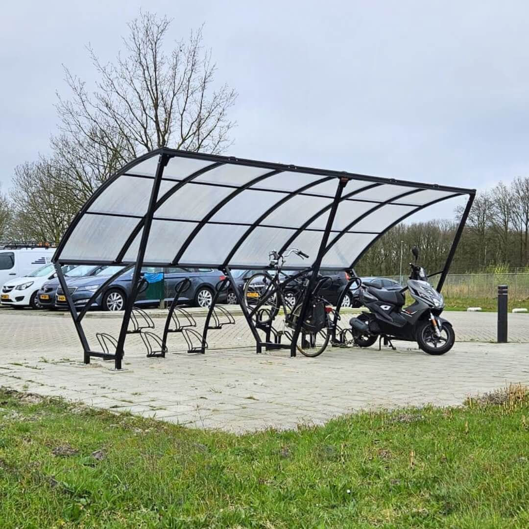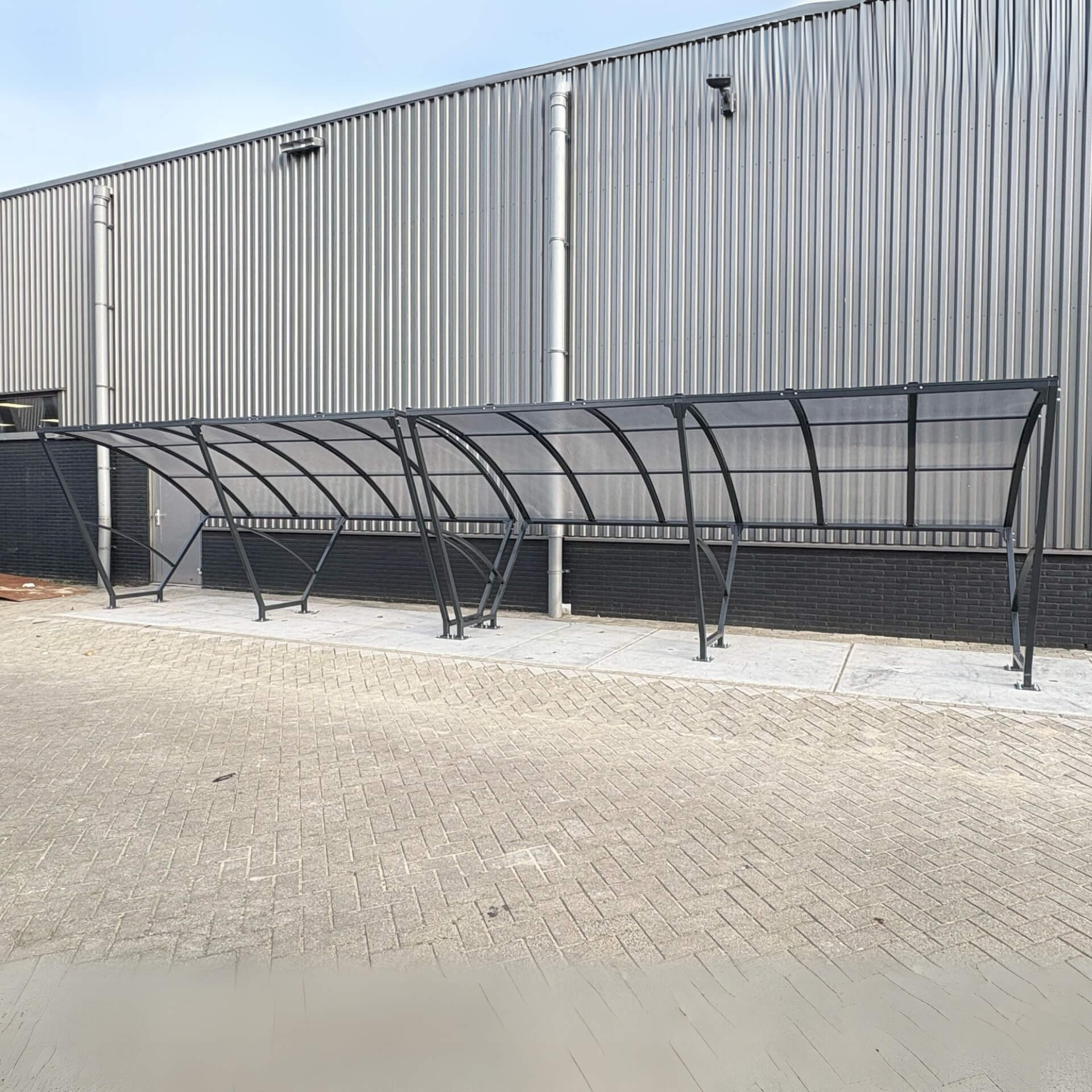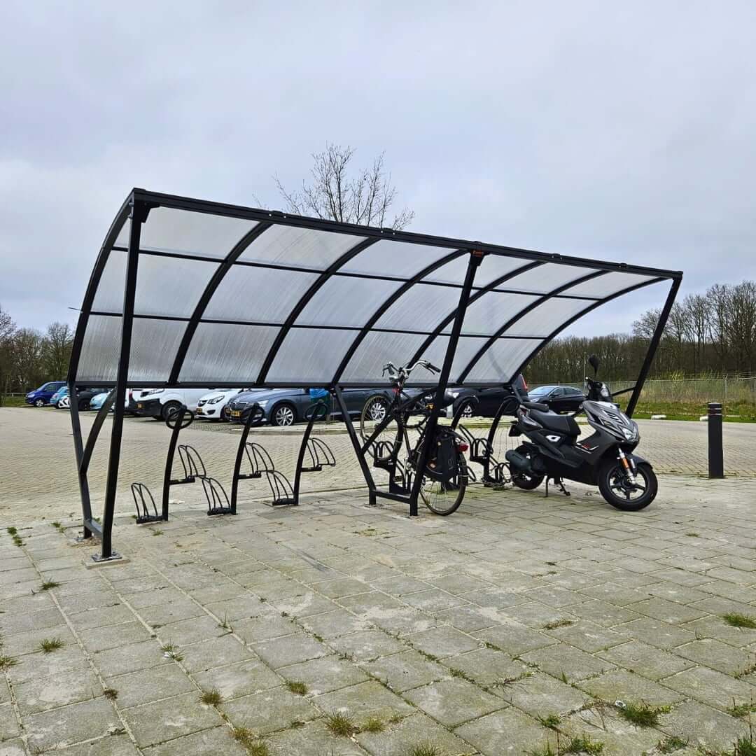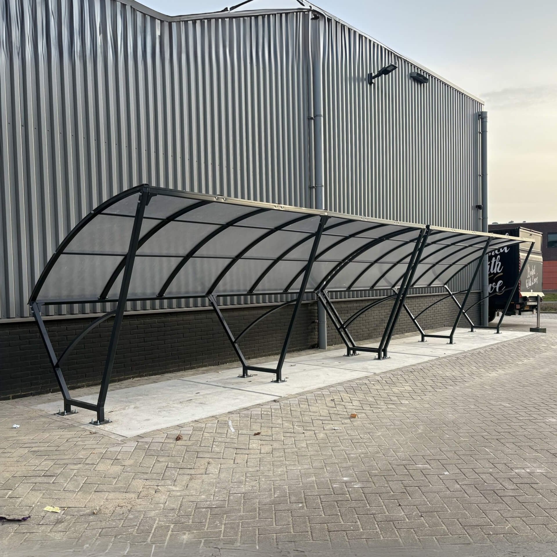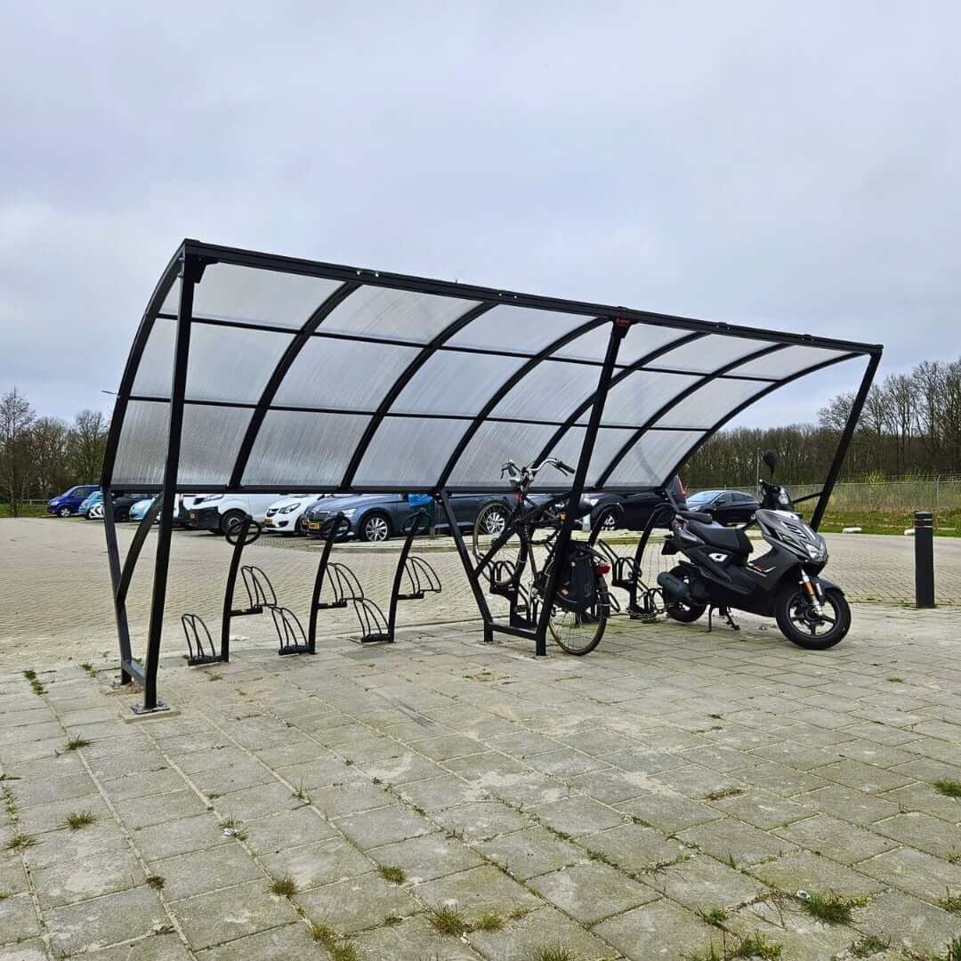 Fietsoverkapping Marne: een stijlvolle, duurzame oplossing voor het stallen van fietsen en scooters. Gemaakt van gegalvaniseerd, gepoedercoat staal in antraciet RAL7016 [overige RAL kleuren mogelijk], met een elegant gebogen dak van polycarbonaat. Deze modulaire overkapping van 5050mm wordt als bouwpakket geleverd binnen Nederland en België.