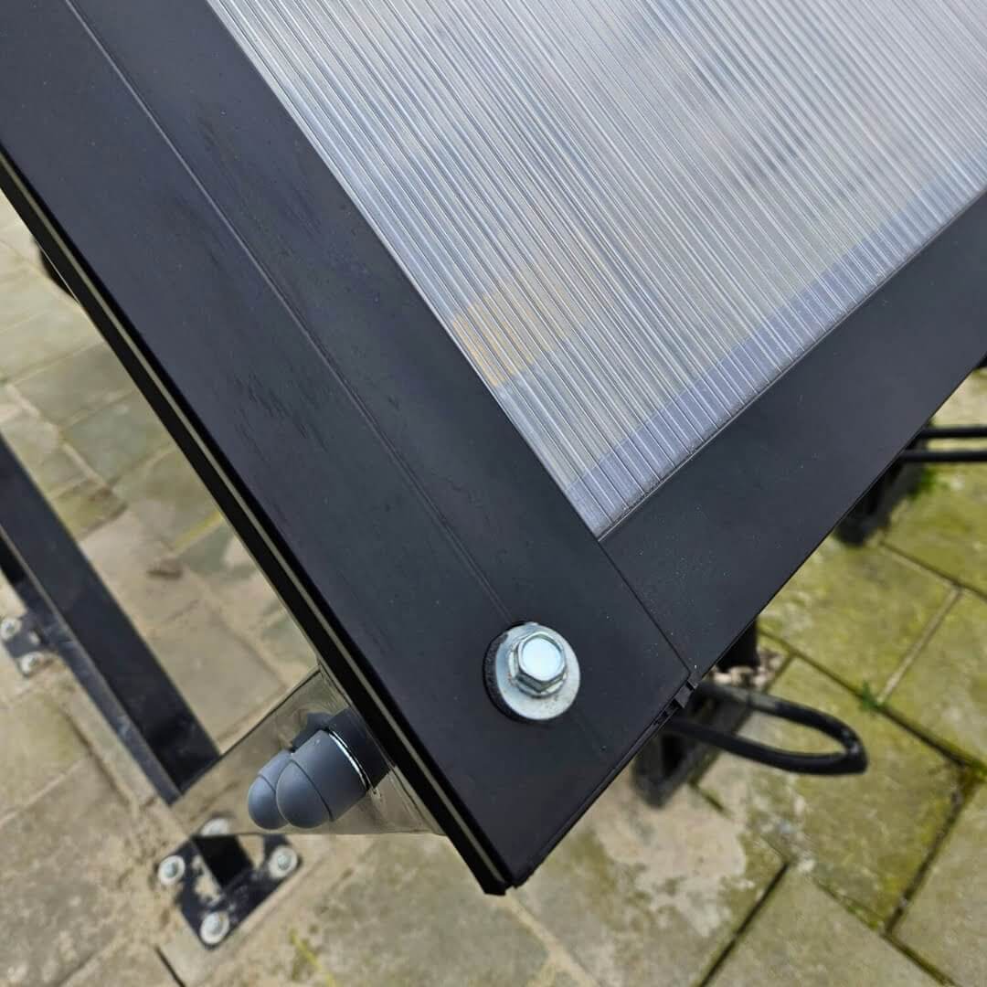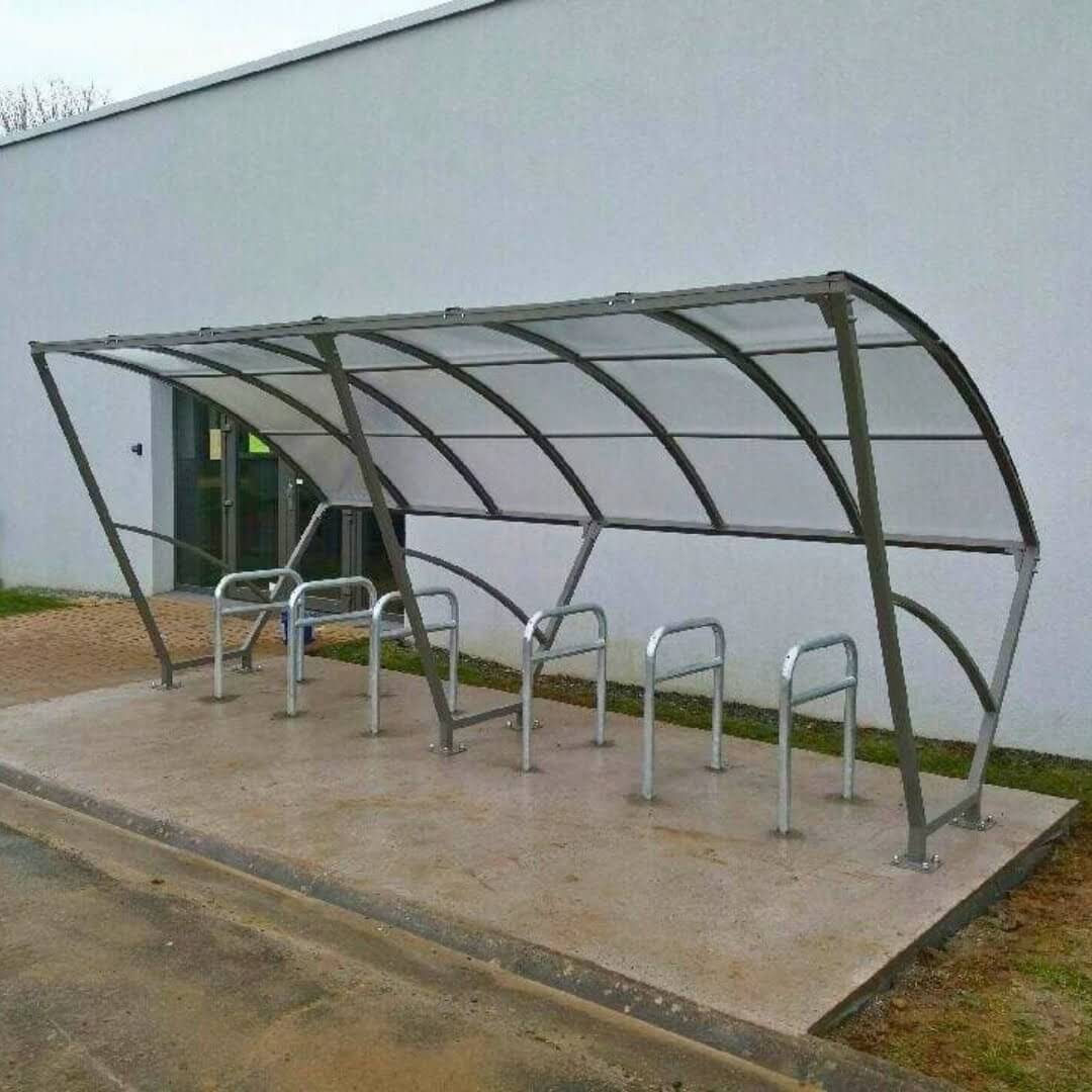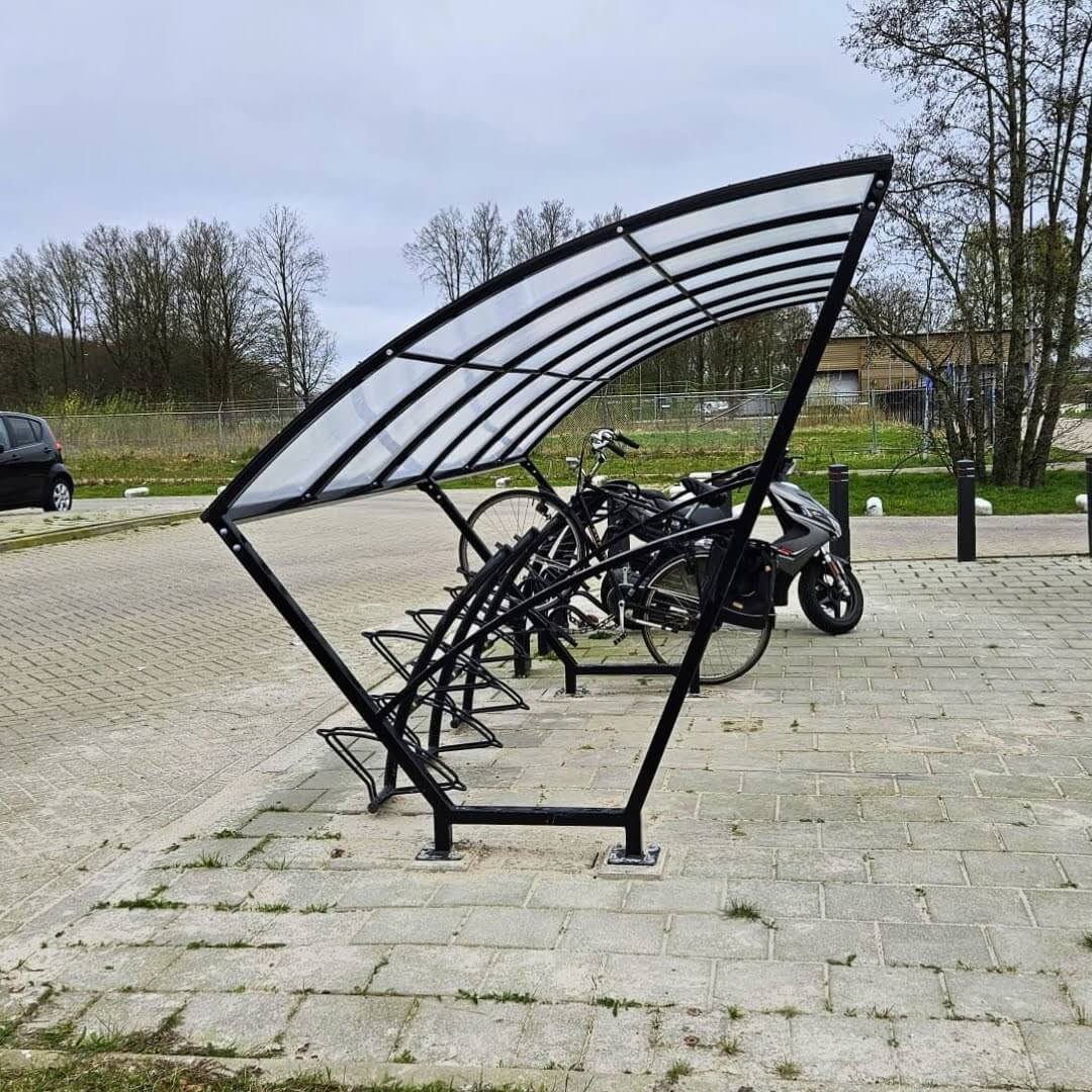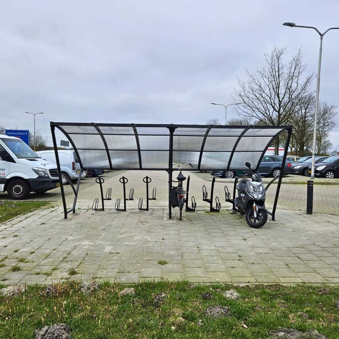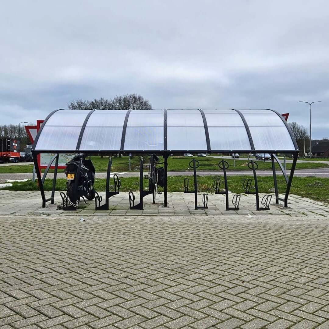 Fietsoverkapping Marne: een stijlvolle, duurzame oplossing voor het stallen van fietsen en scooters. Gemaakt van gegalvaniseerd, gepoedercoat staal in antraciet RAL7016 [overige RAL kleuren mogelijk], met een elegant gebogen dak van polycarbonaat. Deze modulaire overkapping van 5050mm wordt als bouwpakket geleverd binnen Nederland en België.
