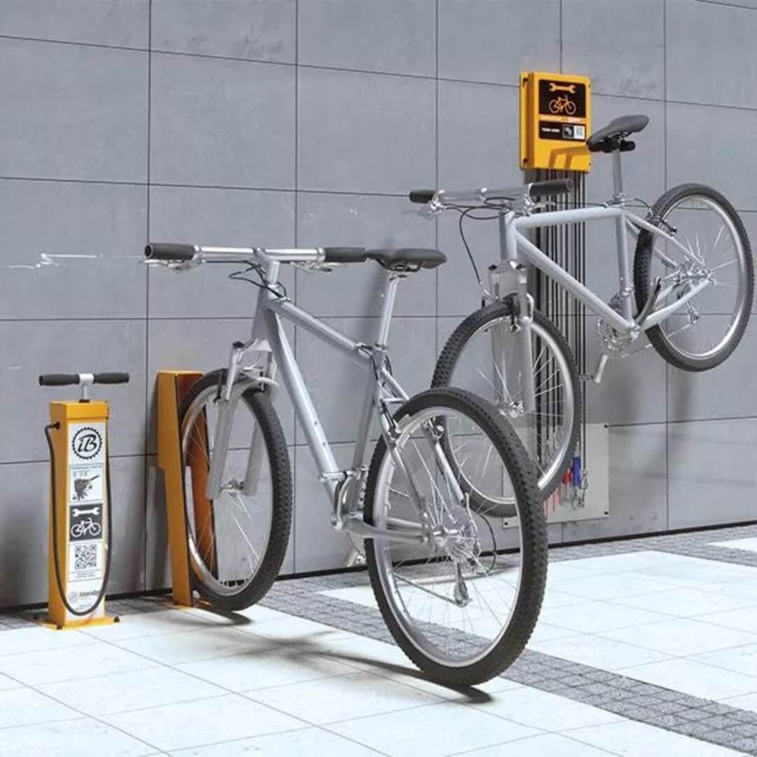 Naast de fietspomp Ibombo biedt Umfeldt ook uitgebreide oplossingen voor fietsreparatie en opslag in de openbare ruimte. De fietsreparatiestations vormen een perfecte aanvulling op de fietspomp. Dit compacte reparatiestation biedt ruimtebesparende mogelijkheden om kleine fietsreparaties uit te voeren. Bovendien biedt Umfeldt robuuste rijwieloverkappingen voor de veilige opslag van fietsen in openbare ruimtes.