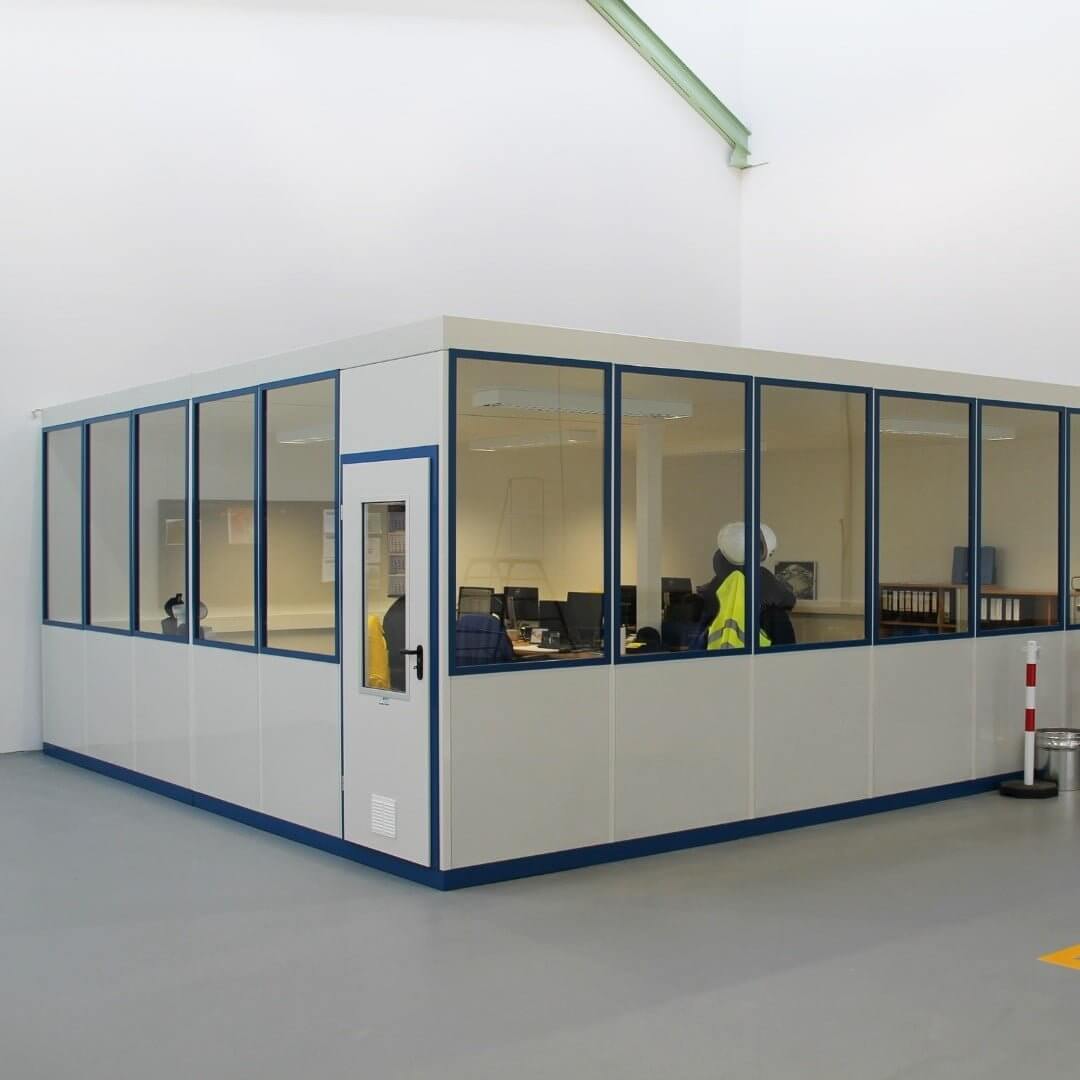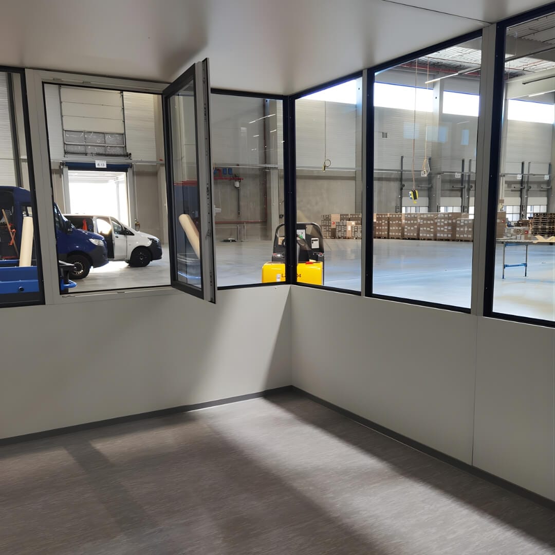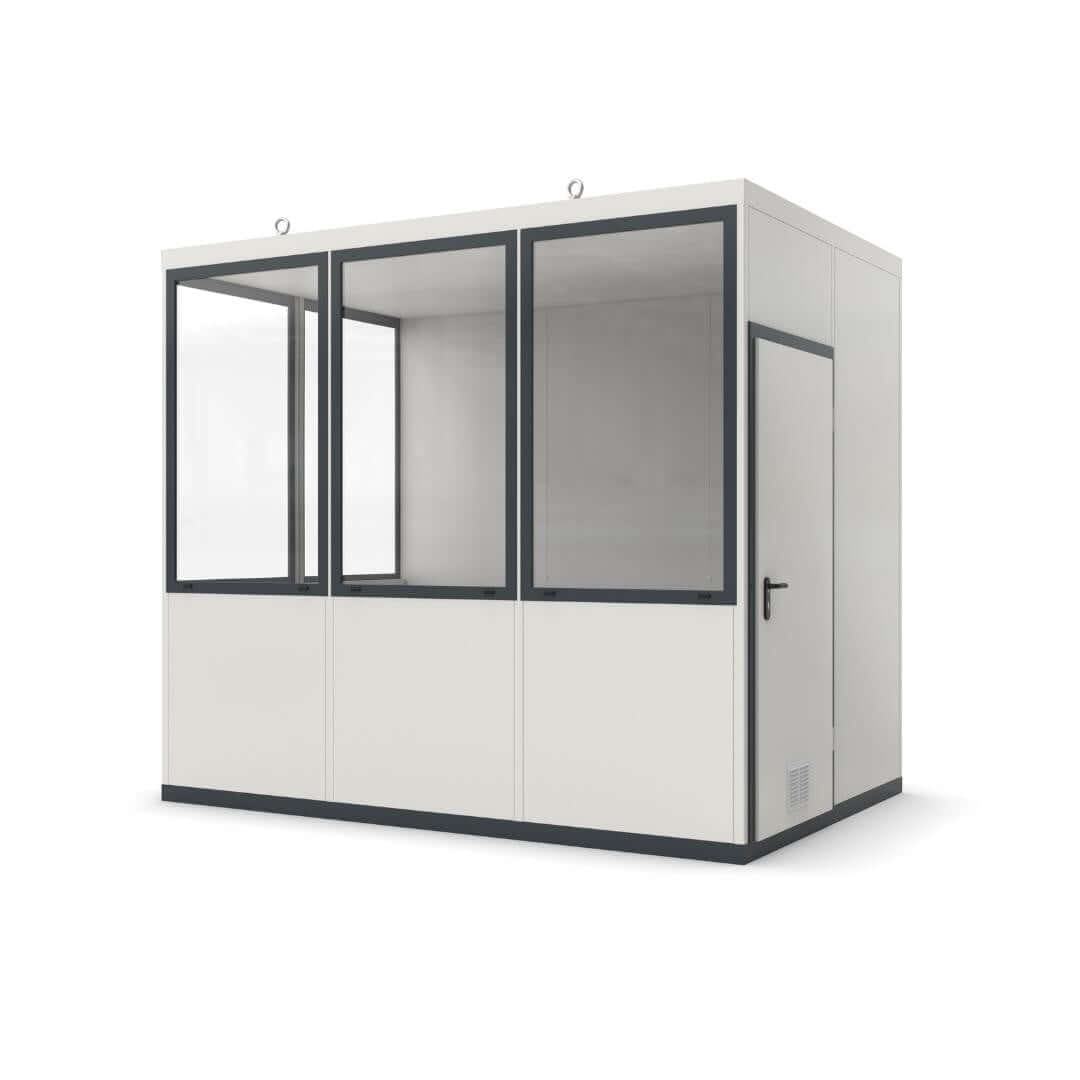 Kantoorunit 3x2m W-serie W10 met vloer, geschikt voor inpandig gebruik. Opgebouwd uit een modulaire constructie van staal en ESG veiligheidsglas. Het frame van de unit is van verzinkt, corrosiebestendig staal. Onze bureelunit W-serie wordt volledig gemonteerd geleverd. Inzetbaar voor diverse doeleinden zoals kantoor, vergaderruimte of operators unit. Onze kantoorunits zijn te voorzien van diverse (elektra) opties.
