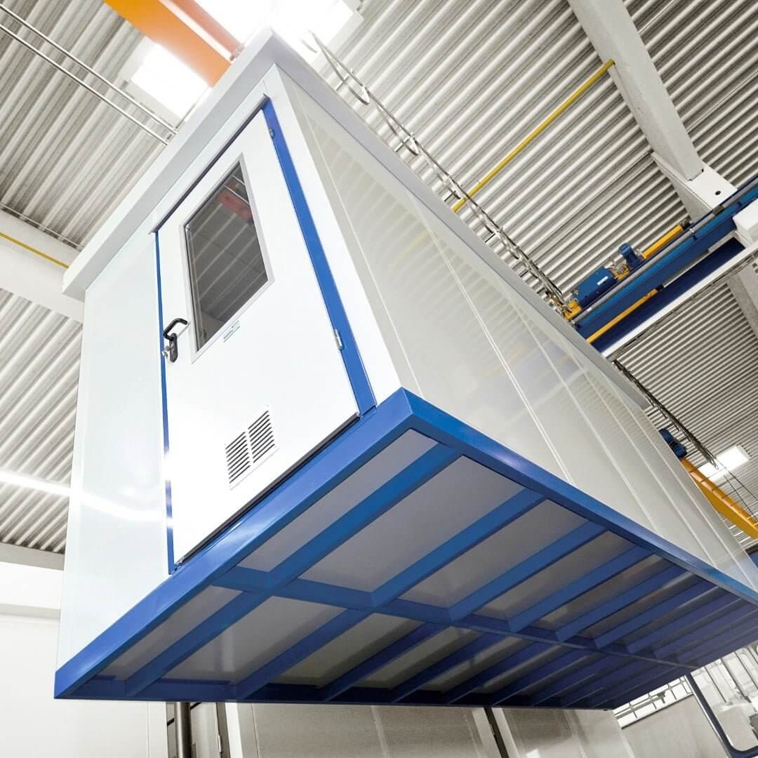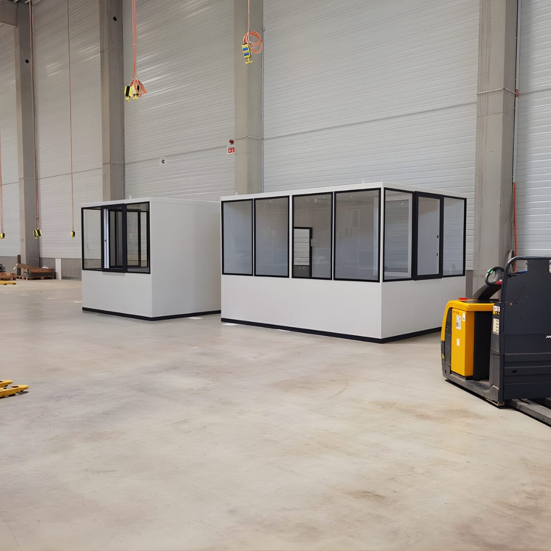 Door de hijsogen is de bureelunit simpel te verplaatsen met een kraan. Wens je de unit te kunnen verplaatsen met een heftruck? Wij kunnen uitsparingen voor heftruck vorken voorzien in de onderzijde van de unit. Tot een maximale afmeting van 6x3m wordt de unit volledig gemonteerd geleverd. Op zoek naar een grote kantoorunit? Bureelunits in een groter formaat worden in prefab delen aangeleverd en door ons gekoppeld bij jou op locatie.
