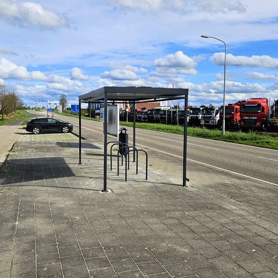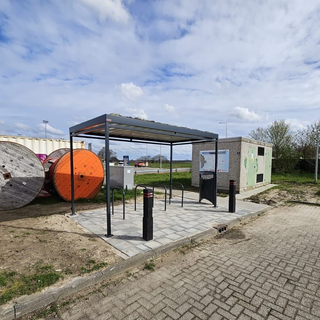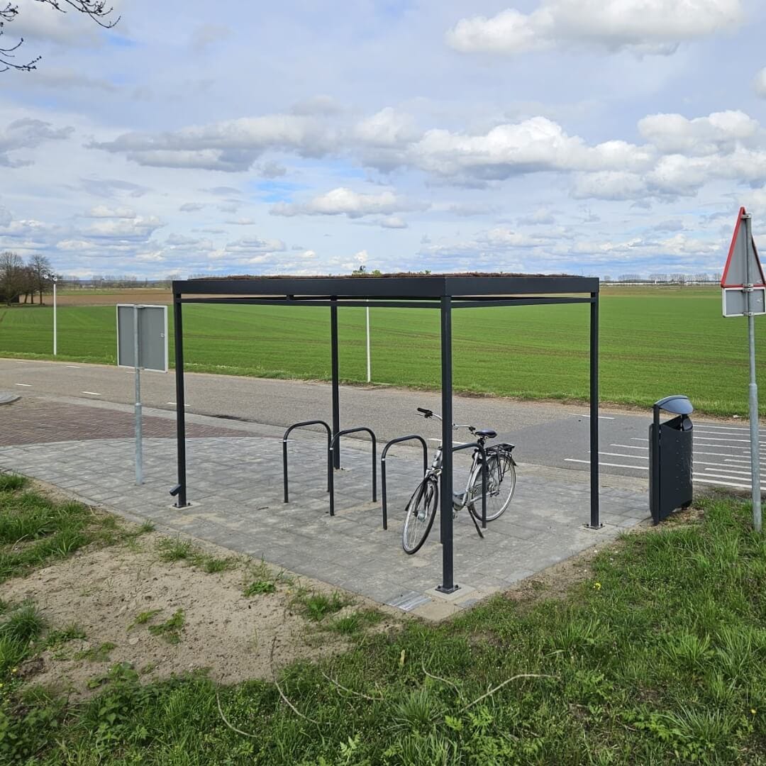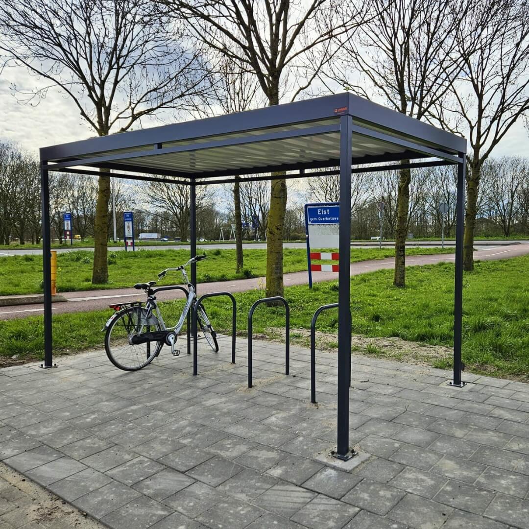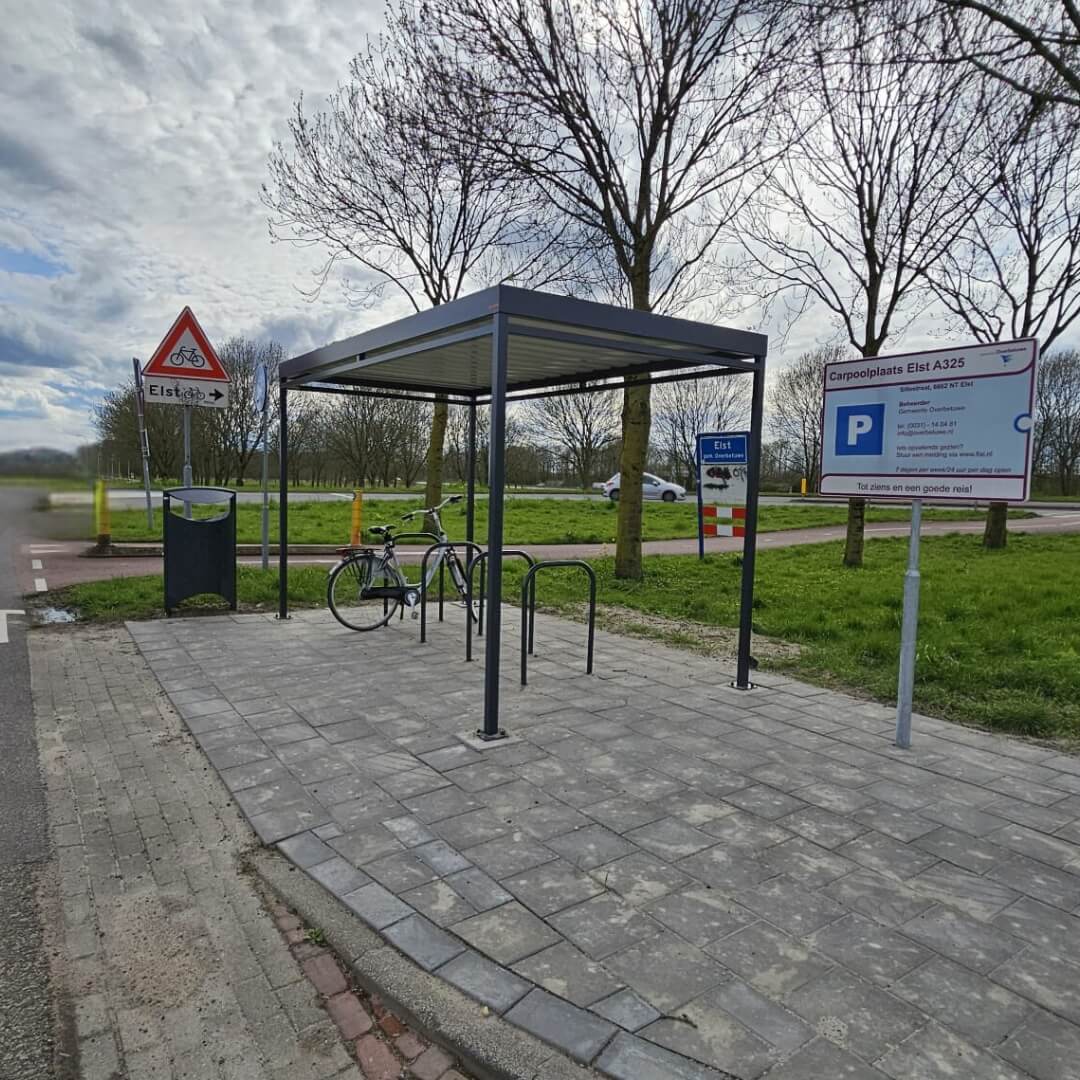 Deze compacte fietsoverkapping van Umfeldt is geplaatst bij de carpoolplaats aan de A325 in Elst. Uitgevoerd in zwart gecoat staal en voorzien van vijf fietsnietjes, biedt de overkapping een veilige en droge stalling voor forenzen en carpoolers.