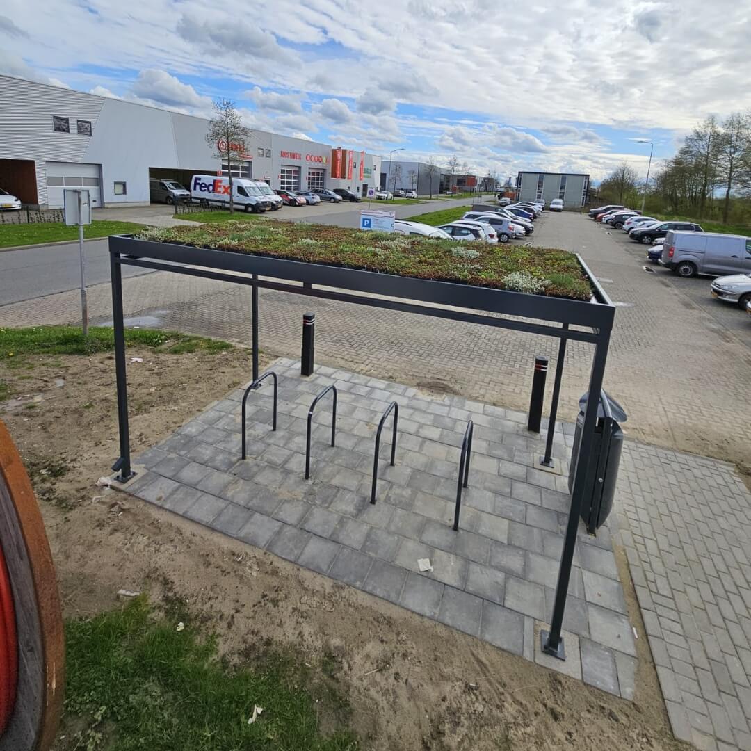 Deze robuuste fietsoverkapping van Umfeldt is uitgevoerd met een sedumdak voor extra waterbuffering en biodiversiteit. De overkapping biedt ruimte aan vijf fietsen en is geplaatst op een strak betegeld plein op een bedrijventerrein. De ideale combinatie van functionaliteit en duurzaamheid.