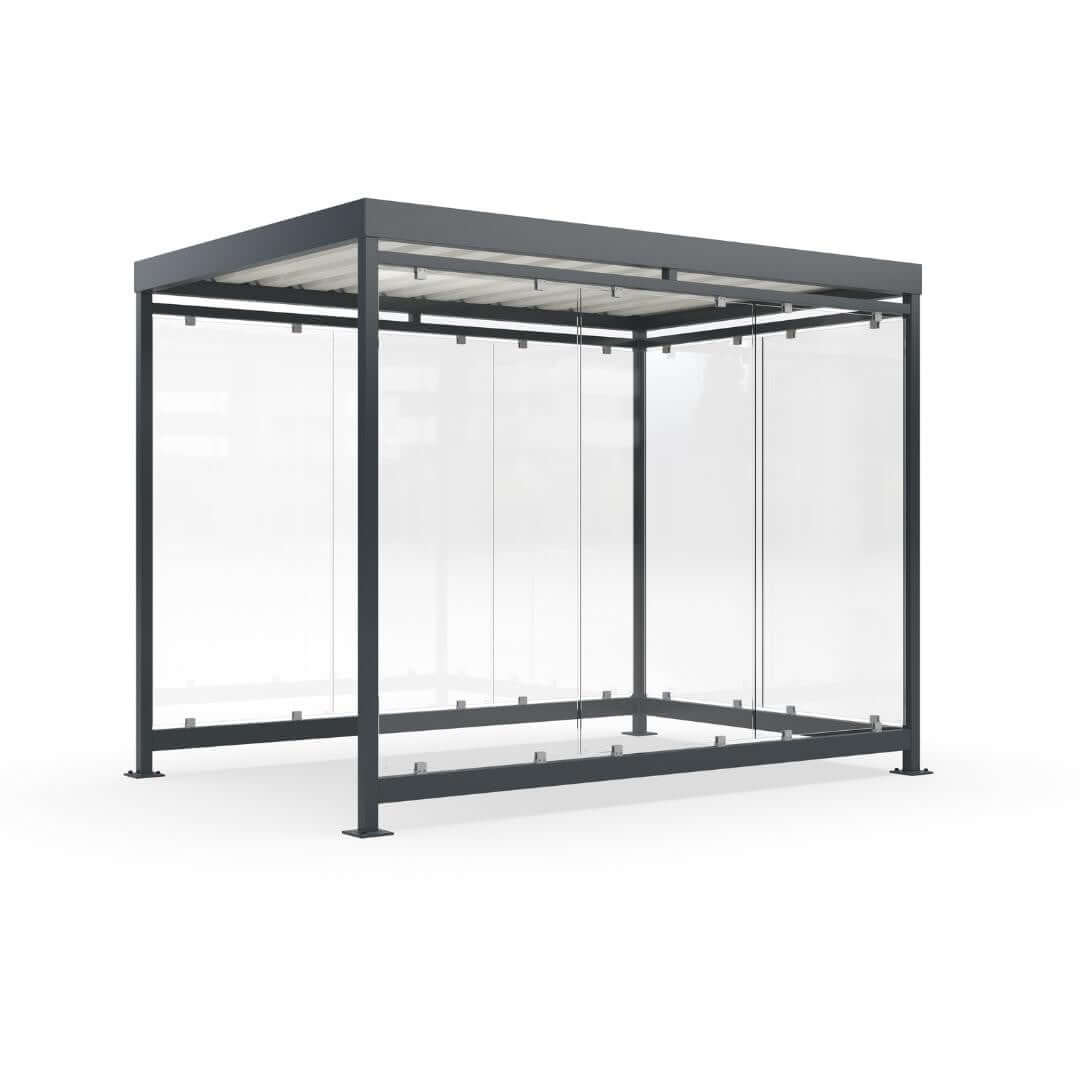 Het platte dak en de volledig stalen constructie bieden bescherming tegen regen wind en sneeuw. Tegelijk blijven niet-rokers uit de rook dankzij de strategische plaatsing van de wanden. Zo creëer je een veilige en hygiënische rookplek die voldoet aan de verwachtingen van gebruikers én facilitair beheer.