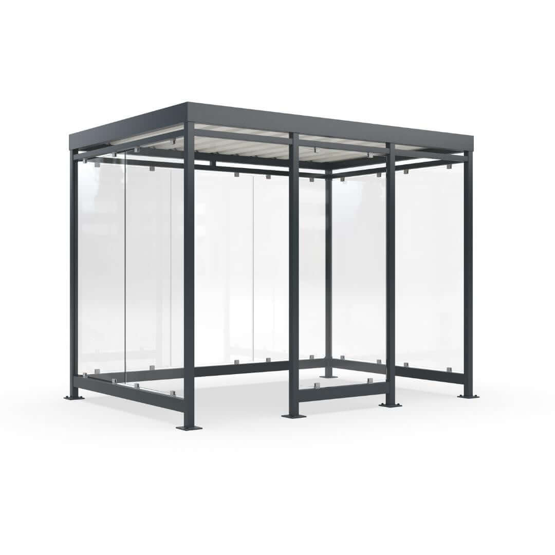 Rokershok Keulen K3 b/a/b (3180x2165mm) met thermisch verzinkt, in RAL-7016 gecoat staal. Wit trapeziumdak (RAL9002), ESG-veiligheidsglas zijwanden en montage via voetplaten. Volledig voor gemonteerd geleverd (hoogte: 2510mm). Optioneel met LED-verlichting, zeefdrukglas, sedumdak, heater, zitbank of asbak. Levering binnen Nederland en België met optioneel installatie binnen Nederland.