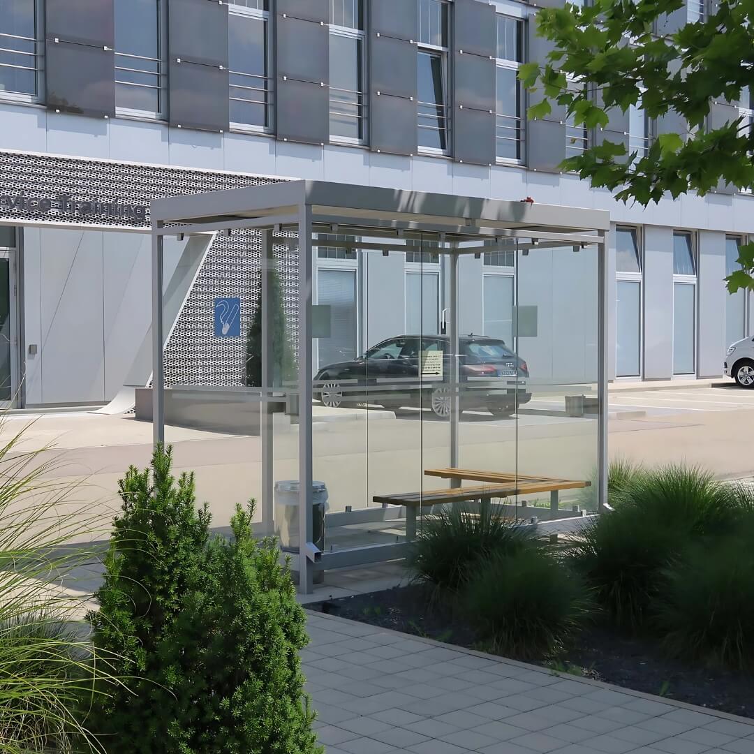 Moderne rookabri van Umfeldt met glazen wanden, optioneel voorzien van zeefdruk, geplaatst op de parkeerplaats van Friesland Campina in Bedum.